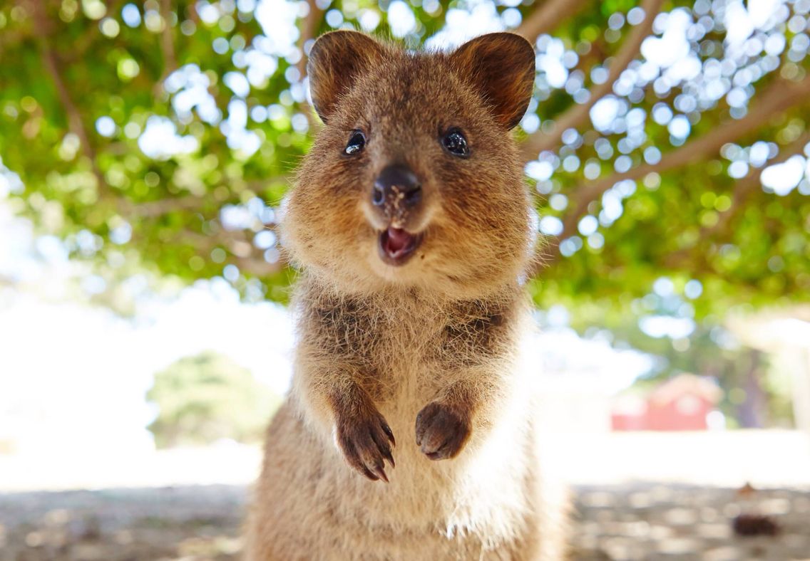 The quokka, also known as the short-tailed scrub wallaby. Known as the happiest animals in the world, Quokkas are herbivores who primarily feed at night, meaning they are mainly nocturnal. They eat the leaves, stems, and bark of many plants in addition to grass. If necessary, they can survive for long periods of time without food or water by living off the fat stored in their tails.