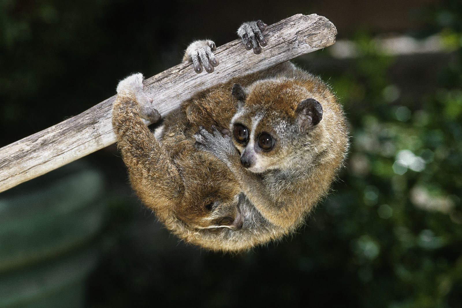 Slow Lorises tend to spend most of the night foraging alone, but little is known about their social structure. During the day, sluggish lorises normally sleep alone, but this does happen on occasion. Adults’ home ranges may overlap greatly, and males’ tend to be greater than females’. Slow lorises are known as ‘malu malu’, or ‘shy one’, in Indonesia because they freeze and hide their faces when approached.